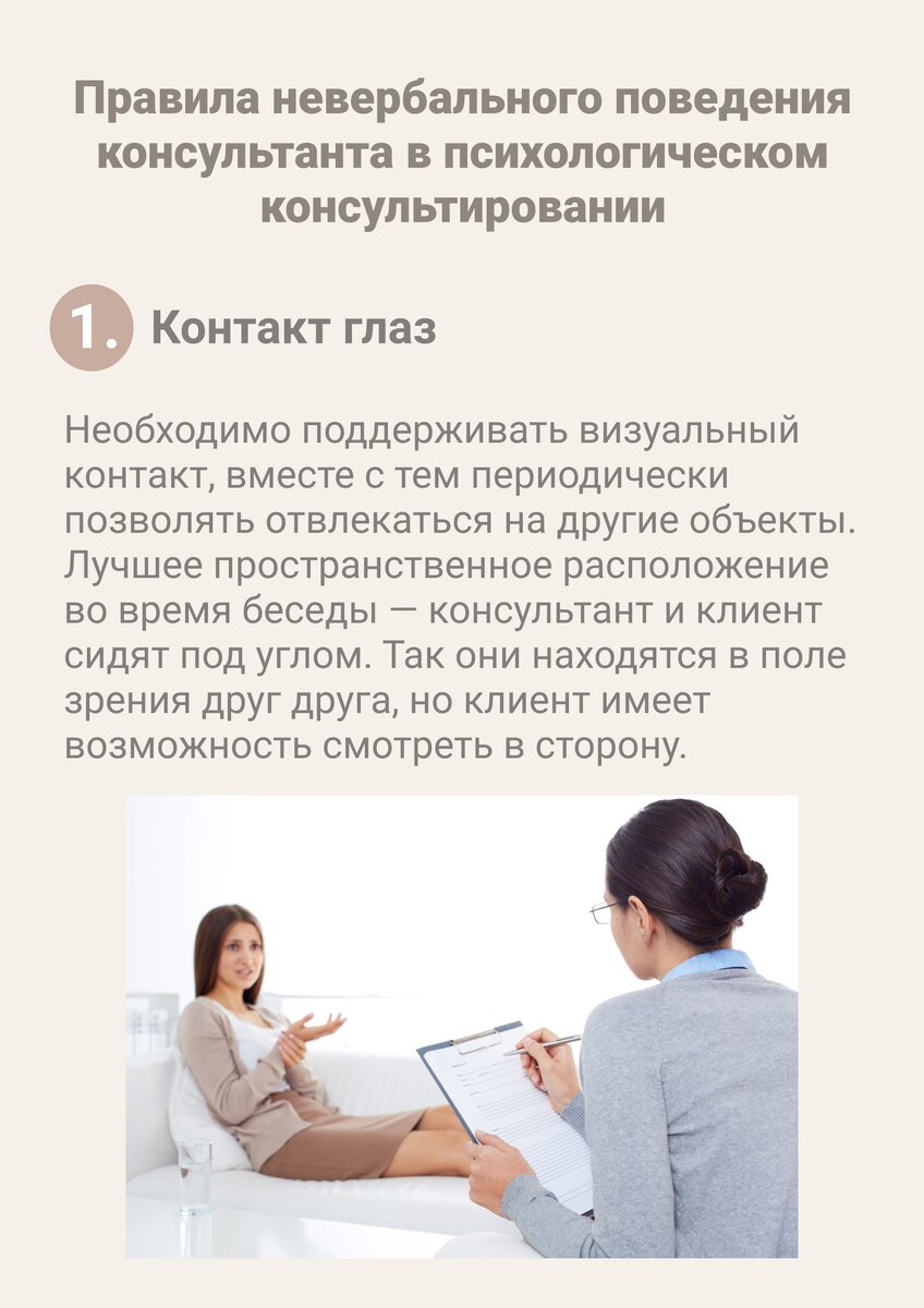 О невербальном контакте и его значении, как в процессе психотерапии, так и для обеспечения эффективности межличностного общения, написано очень много. Связано это не только с тем, что одно и то же слово, сказанное по-разному, приводит к различному эффекту. Невербальные реакции в меньшей степени, чем вербальные, находятся под со-знательным контролем человека. Здесь начинающий консультант может с