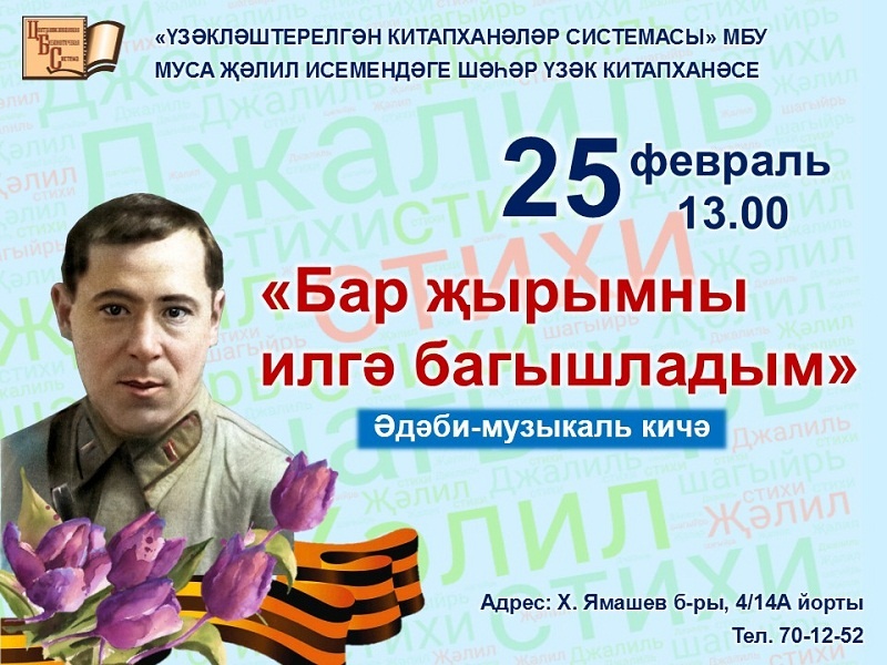 25 февраля в 13.00 в Центральной городской библиотеке состоится литературно-музыкальный вечер «Бар җырымны илгә багышладым» , посвященный 115-летию со дня рождения Мусы Джалиля.