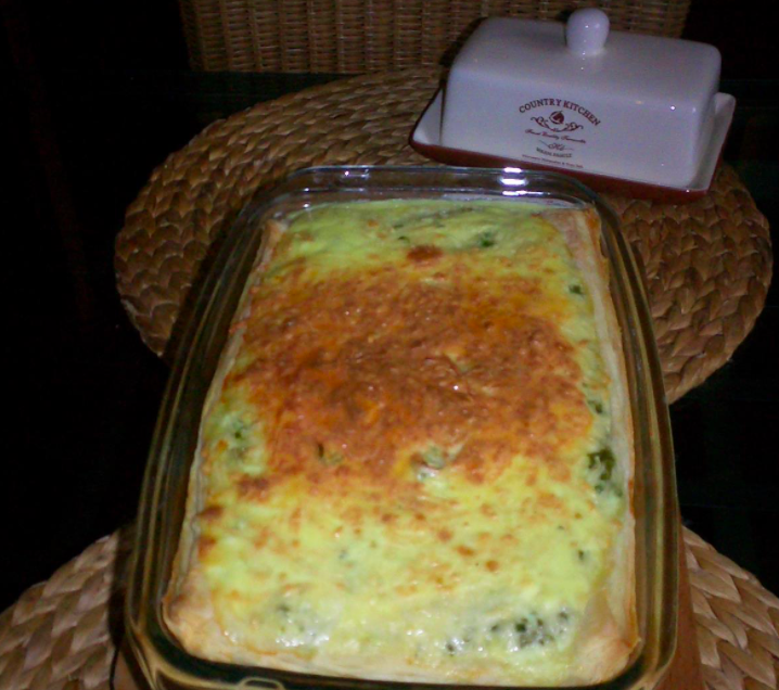1. 1 пластинка слоёного покупного дрожжевого теста: раскатать и выложить в смазанную маслом стеклянную или любую другую форму для выпечки с высокими бортиками.