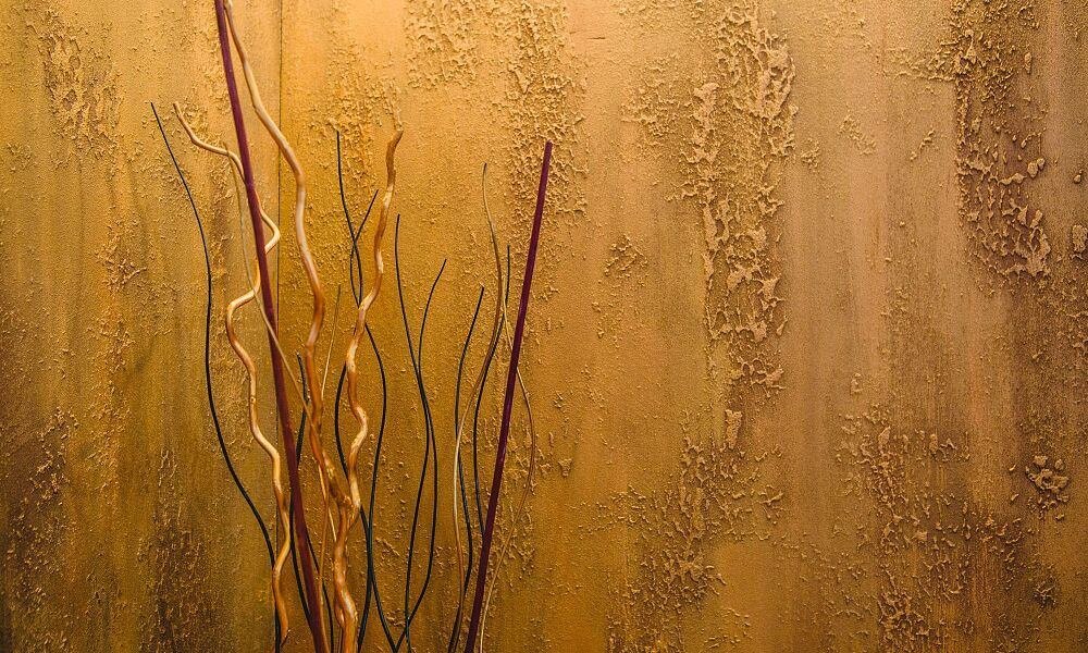 Золотистые переливы, от ярко жёлтого до практически красного, благородно и завораживающе играют на неравномерной фактуре, имитирующей срез горной породы.