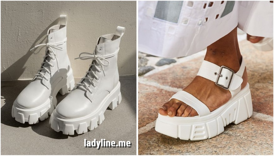Актуальные грубые ботинки на тракторной подошве со шнуровкой благородного белого цвета, были и остаются на лидирующих позициях в современной индустрии моды.
