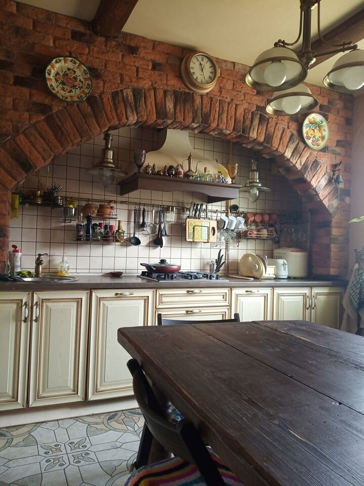 За неимением печки роль домашнего очага в квартире выполняет газовая плита)). Ее обрамлением стала кирпичная арка. Конечно, имитация. Сама арка из гипсокартона, оклеена фасадным состаренным клинкерным кирпичом.
