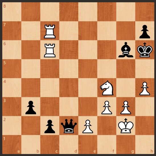 Предлагаю Вашему вниманию фрагмент партии Жидков - Витолиньш, 1976 год. У белых две ладьи, а у черных ферзь. Причем, две ладьи пытаются сдержать две черные пешки, которые ужу подошли близко к первой линии. Однако ход белых, и они выигрывают.