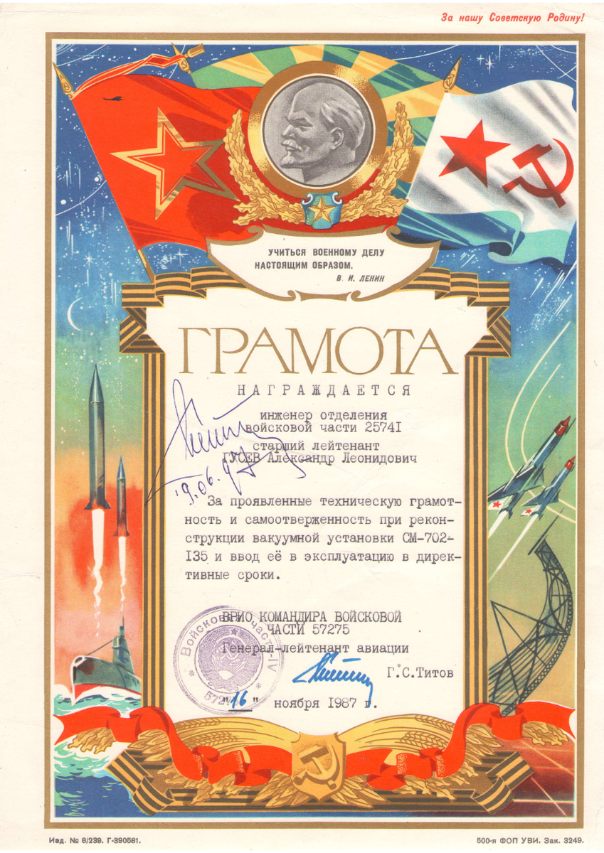Подписал грамоту второй космонавт СССР генерал -лейтенант авиации Герман Степанович Титов, который был тогда нашим начальником.