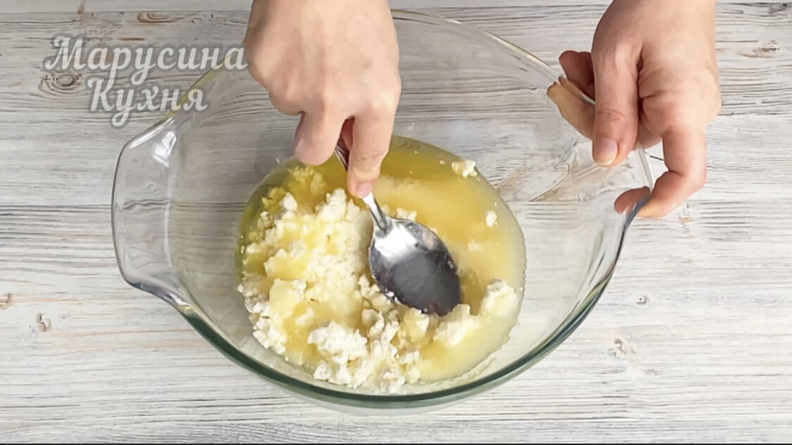 К творогу всыпаю муку с разрыхлителем. Перемешиваю ложкой. Пока смесь будет сухой и мало напоминает привычное тесто, но скоро все изменится.