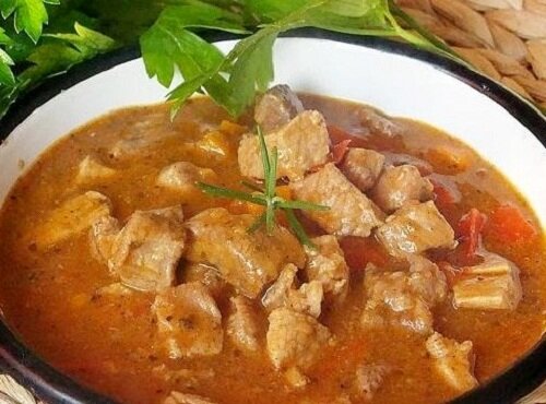 Это классический вариант блюда. Получается очень ароматным и аппетитным, как в столовых, а то и еще лучше, ведь готовится оно дома и с любовью. По сути, это сочное, нежное мясо в томатном соусе. Готовить можно или в толстодонной сковороде, или в казане.