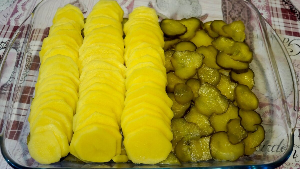Затем на тонкие пластинки нарежем 560 грамм картошки. Если вам нужно больше гарнира, количество картошки можно увеличить. Нарезанную картошку выкладываем поверх огурцов вот таким образом.
