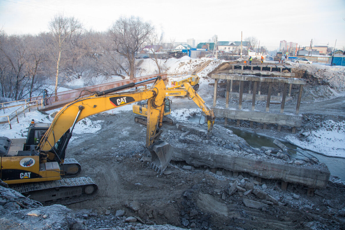 В настоящее время завершаются работы по демонтажу железобетонных конструкций моста: пролетов и опор. На площадку начали завозить все необходимое для начала строительства: каркасы под буронабивные сваи и технику. Строители до паводка должны завершить все работы на мосту в русловой части.