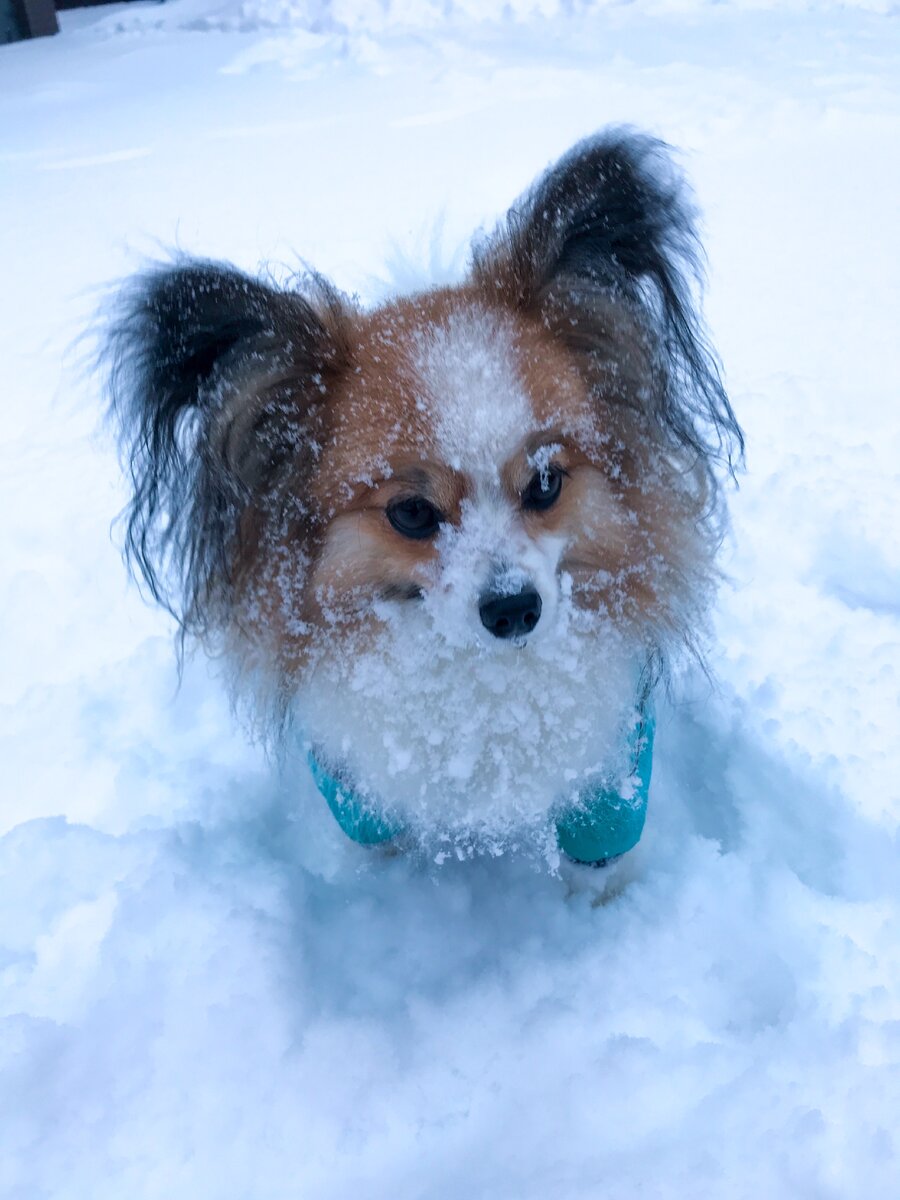 В один момент я поняла, что Кексу сложно идти, проверила и поняла, что снег комками налип на передние и задние лапы, на штанишки. Рукой я сломала, как смогла, эти шарики, но полностью их убрать не получилось, ведь я могла бы оторвать снег вместе с шерстью.