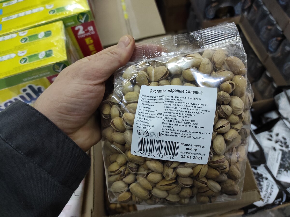 Фисташки жареные и соленые. В прозрачной упаковке 500 грамм фисташек. На вид фисташки в упаковке хорошего качества, у нас в "Светофоре" они пользуются большой популярностью и быстро исчезают с полок магазина.
