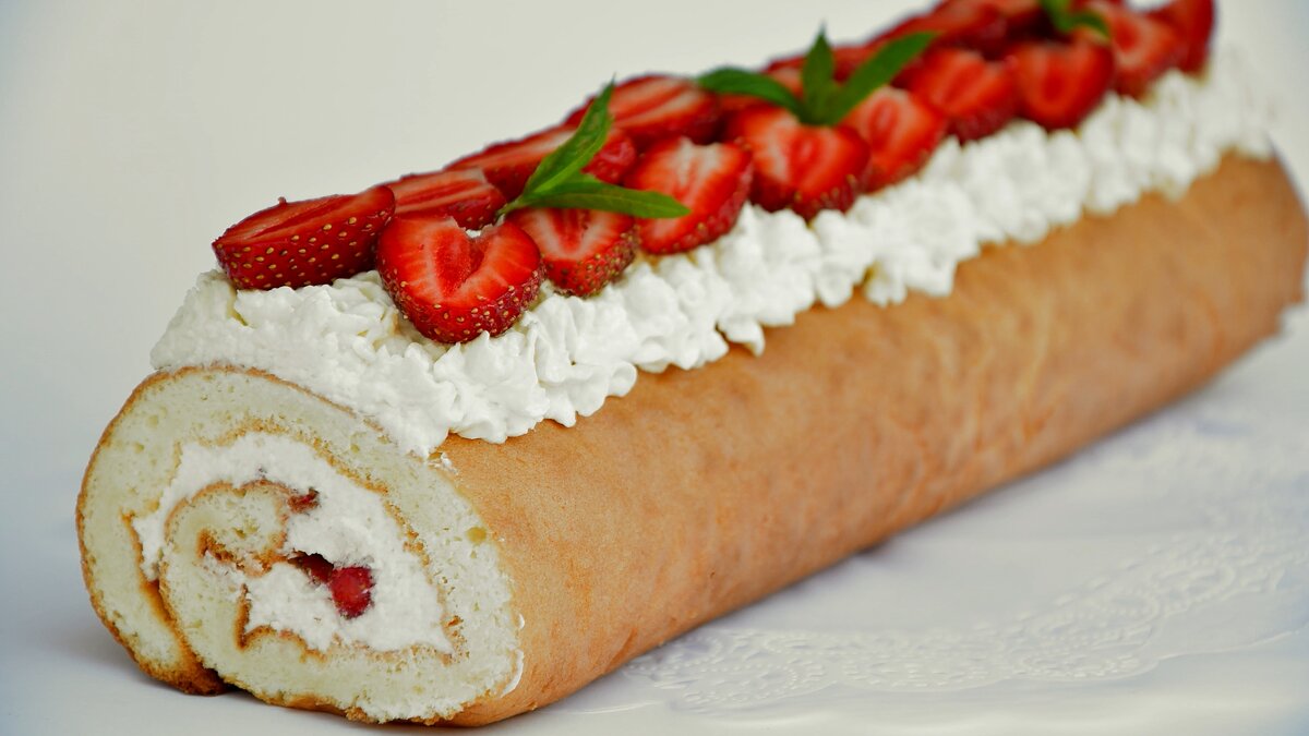 Яйца с 3 столовыми ложками холодной воды взбить до состояния густого крема. Продолжаем энергично взбивать крем венчиком, постепенно добавляем обычный и ванильный сахар. Муку смешаем с крахмалом и пищевой содой, просеиваем, высыпать на крем и аккуратно перемешаем. Выложить полученное тесто тонким слоем на противень, покрытый пергаментной бумагой и выпекаем в разогретой духовке минут 15-20. Затем сразу же выложить пласт на обсыпанное сахаром кухонное полотенце, снимаем пергамент, потом пласт скатать в трубочку вместе с полотенцем и выставить на холод. Теперь займемся кремом. Взбить сливки, постепенно добавляя теплый раствор желатина, обычный и ванильный сахар. Часть клубники отложить для украшения, остальные ягоды разрезать на четыре части. Желатин залить 2 ст.ложками холодной воды и дать набухнуть в течение 10 минут, а затем растворить в теплой воде. Треть взбитых сливок оставить для украшения. Остальные сливки смешать с клубникой, развернуть рулет, выложить на пласт слой смеси сливок с клубникой и снова скатать. Полученный рулет украсить взбитыми сливками и клубникой.