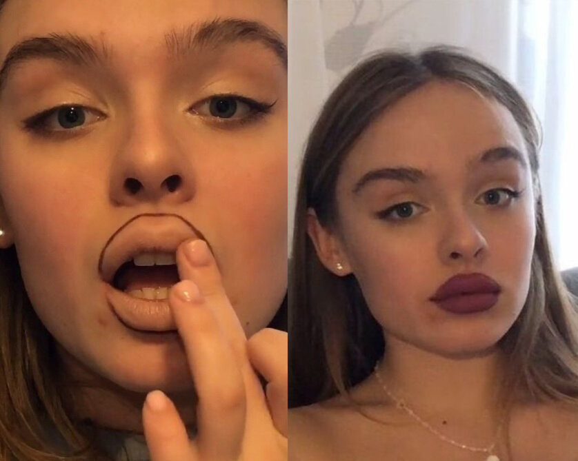 Можно, конечно, похвалить девушек за то, что они, хотя бы, не прибегают к уколам и искусственным наполнителям. Но есть гораздо более натуральное средство: просто сходите к хорошему визажисту и он научит вас с помощью разных оттенков помады, блеска, добиваться эффекта пухлых губ, как это делала Мэрилин Монро — и никаких губ под носом рисовать не придётся.