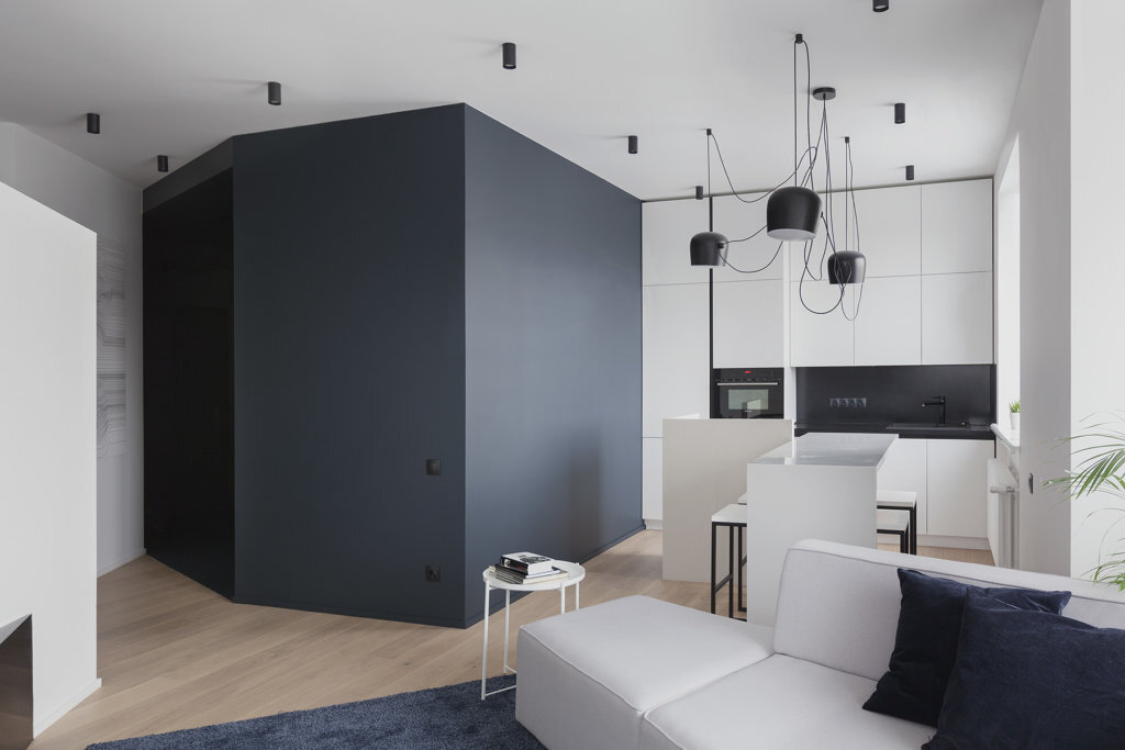 Здесь будет всё, что нужно: и полки, и места для хранения, и розетки. Решение поистине гениально! Ведь так и доступ к кухне-гостиной остаётся открытым, и кабинет как бы за дверью. То есть ощущения беспорядка не возникнет.