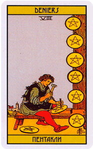 Полное описание колоды на сайте: Мастер сел на скамью и увлеченно трудится. Он весь в процессе. На стене уже вывешены готовые работы. На полу лежат и стоят заготовки для будущих. Ответственное прохождение Семерки Пентаклей открывает герою перспективы. К концу этапа он точно знает, чего хочет и как это получит. И на Восьмерке он, засучив рукава, бросается в работу. Он увлечен и ничего другого не замечает. Сейчас он счастлив трудом. Он обращен вовнутрь и внешний мир перестал его беспокоить. Задача аркана проста. Отбросить все былые сомнения и начать делать то, что казалось всегда ждало мастера. Уйти в этот процесс с головой. Жить им. Ну и, конечное, довести начатое до конца. Перевернутая Восьмерка Пентаклей труслива и ленива. Реальное дело после себя оставляет реальный результат. А это много. Это ответственность за него. Это оценка творца внешним миром. Это изменение своего будущего. И одно дело размышлять об этом, а другое – произвести. Своими руками. Других виноватых уже не будет. К