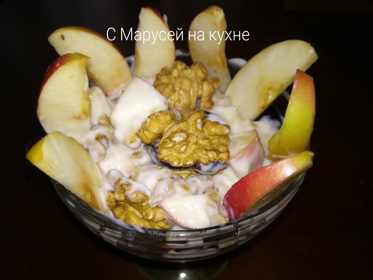 Через 15 минут достаём салатник и украшаем его дольками яблок и грецкими орехами.