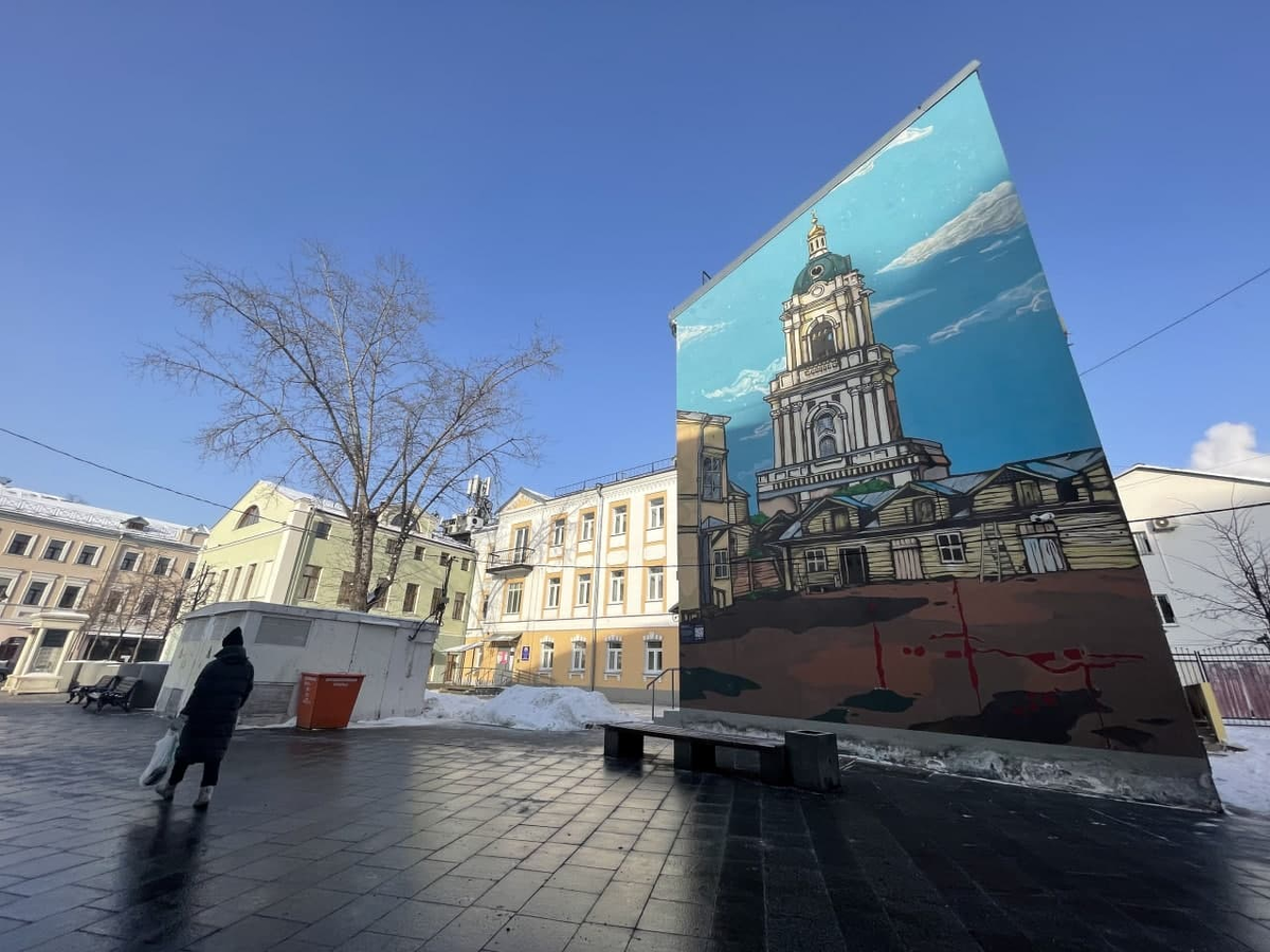 Выйдя из вестибюля станции обратите внимание на граффити на стене дома № 21 с правой стороны с изображением колокольни церкви великомученицы Параскевы Пятницы.
