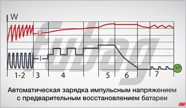 Зарядное устройство с десульфатацией позволит решить проблему гораздо быстрее и эффективнее. В моделях Fubag предварительно проводится тестирование батареи. При необходимости выбирается функция десульфатации. Зарядка ведётся кратковременными импульсами, разрушая солевой осадок и постепенно переводя его в раствор и на электроды.