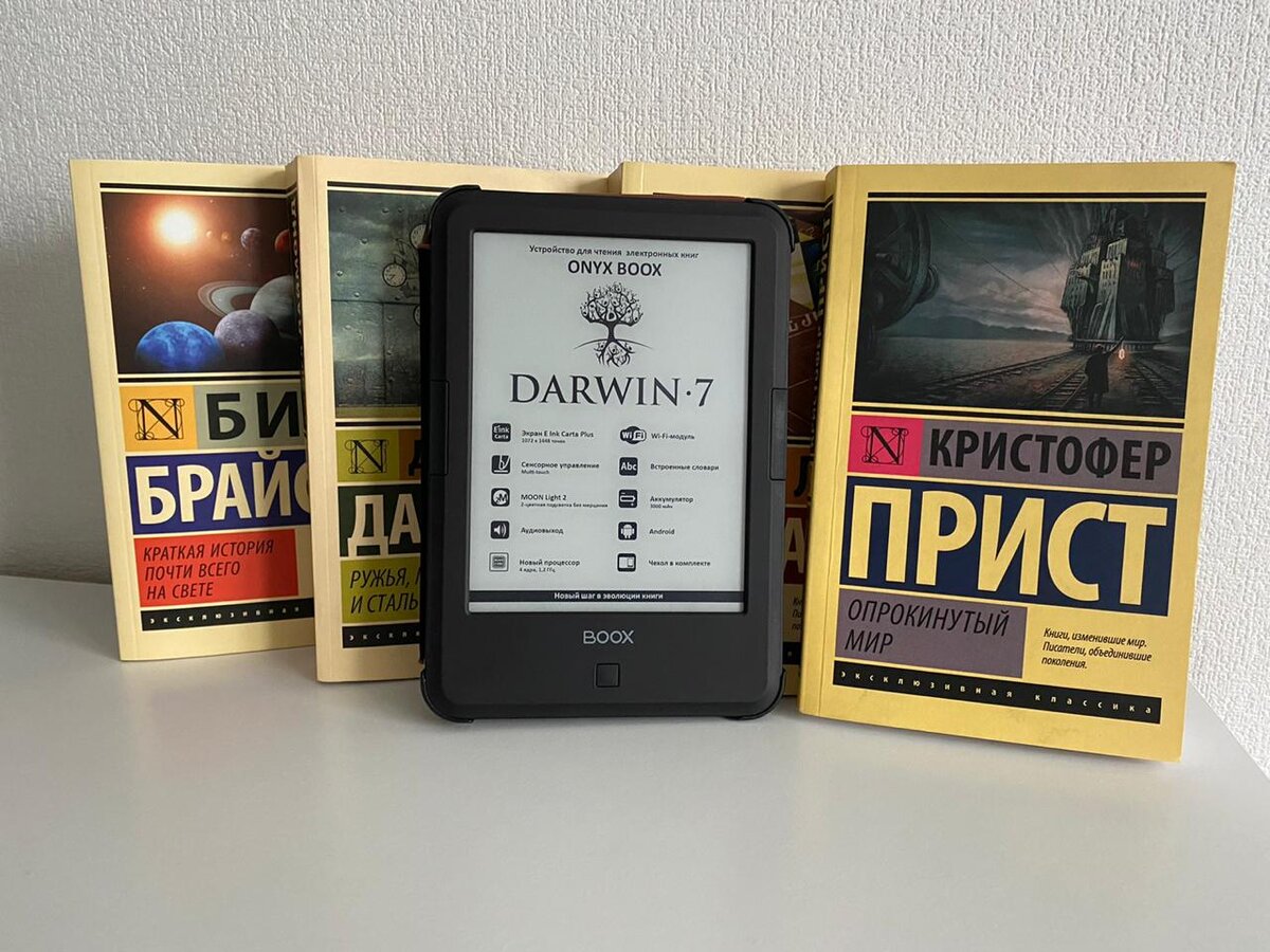Я взял себе ONYX BOOX Darwin 7. По сравнению с прошлой моей книгой и книгой моей девушки ( у нее старенькая ONYX BOOX Victoria) заряд держит хуже. Зато для моего глаза цвет экрана и чернил стал приятнее, появившаяся регулируемая подсветка позволяет читать с удобством и ночью ( из-за нее, наверное, батарея хуже держит заряд).