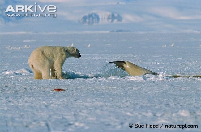 Единственные два сообщения о подобных случаях, которые мне удалось найти, выглядят противоречиво. В одном из них утверждается, что в заливе Баффина у полыней, где белухи оказываются в ловушке, «собираются небольшие группы медведей, которые убивают маленьких китов, вытаскивают их на берег и поедают». Согласно другому сообщению, относящемуся к евразийской Арктике, нападения одиночных медведей на белух случаются часто, и когда медведь находит группу белух, оказавшихся в ледяной ловушке, он остаётся поблизости и успешно убивает их (до 13 за раз по достоверным источникам).