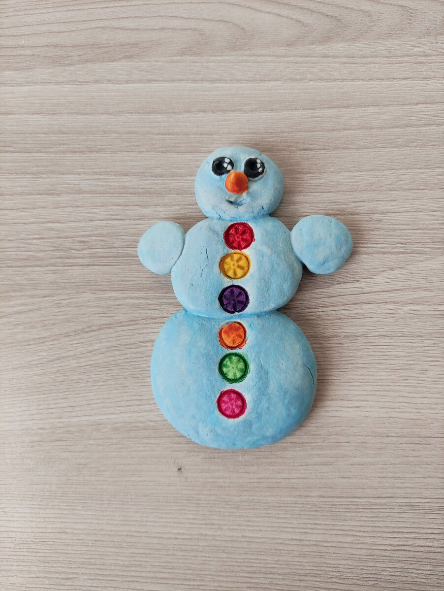 Теперь красим. Так как снеговик белый и высохшее тесто тоже белое, решаем красить голубым. В красках часто нет голубого, смешиваем на бумажке белый и немного синего. Смешивать - отдельное удовольствие, мешают даже те, у кого голубой есть)