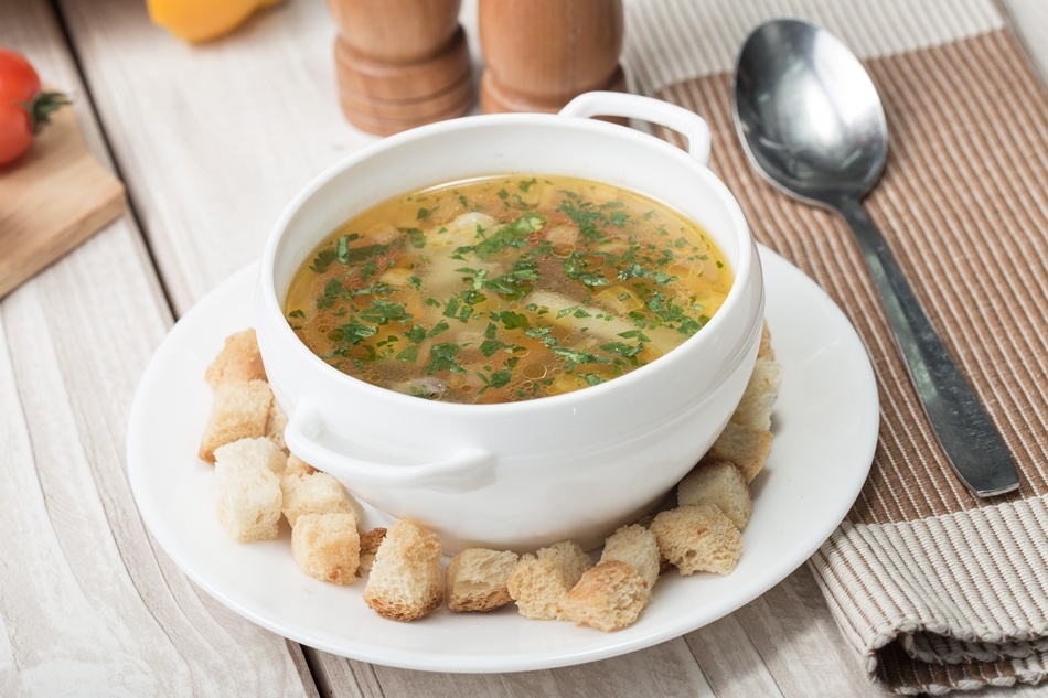 8. Готовый суп разливаем по тарелкам. Подаем наш суп сухариками, а кушаем с удовольствием.
