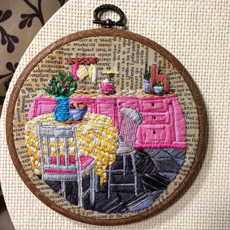 И если кому то это кажется скучным и отталкивающим, то я хочу вам представить работы российской художницы Елены Моарт, в которых абсолютно всё: от подбора цвета нити до вышитых интерьеров вызывают ощущения тепла и уюта родного дома.