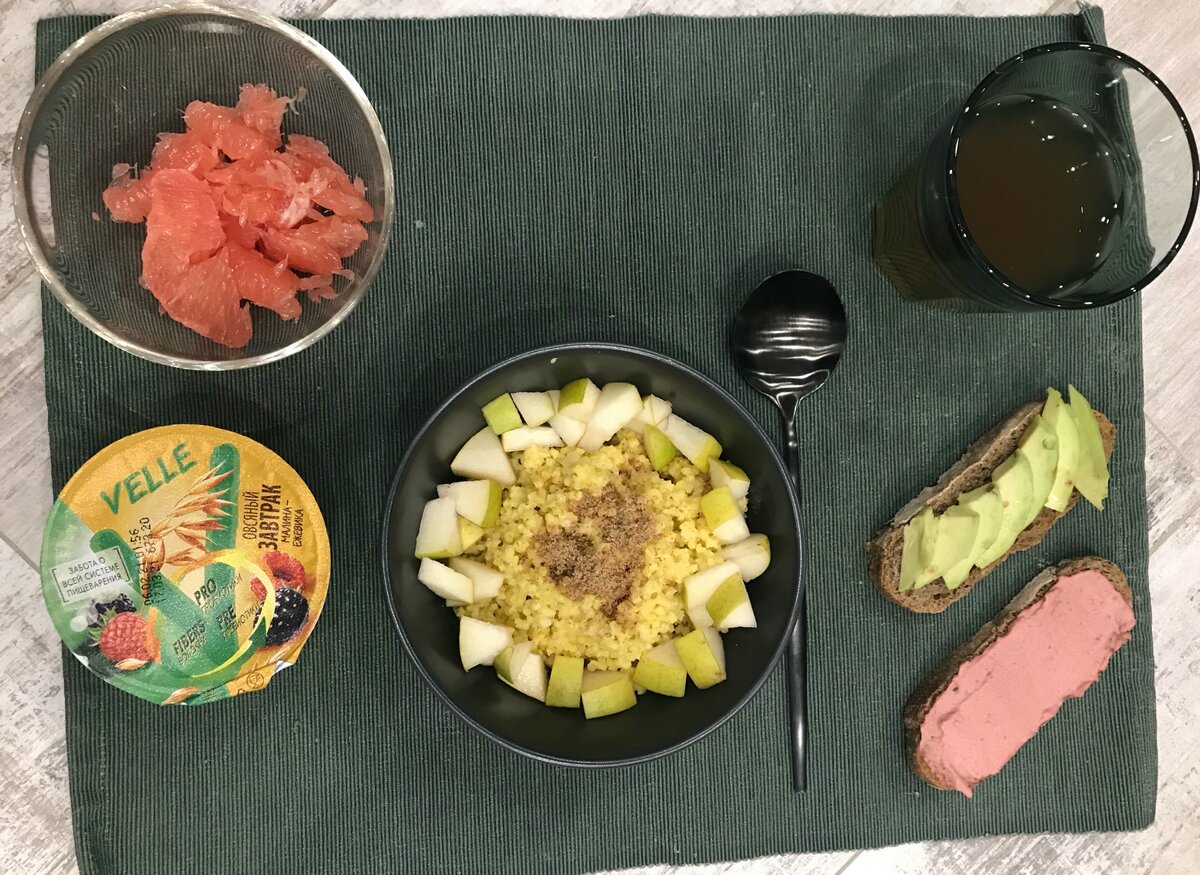 Стаканчик домашней комбучи, пшёнка на ванильном молоке со свежей грушей, перемолотыми семенами льна и ложечкой кокосового масла, поджаренный до хруста ржаной хлеб с авокадо, солью и лимонным соком, поджаренный до хруста ржаной хлеб с луковым паштетом, овсяный йогурт от Velle "Малина-ежевика" и грейпфрут, очищенный от плёнки и прочего альбедо.