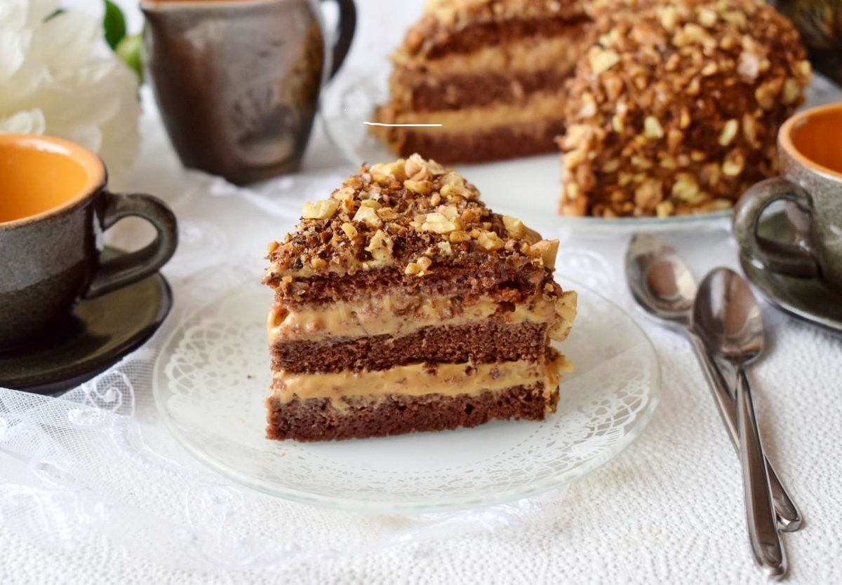 Для приготовления крема сливочное масло комнатной температуры хорошо взбить со сгущенкой с помощью миксера на самой высокой скорости и смазать получившимся кремом остывшие коржи. Сложить коржи друг на друга. Можно украсить торт тертым шоколадом и рублеными орехами - грецкими, фундуком или миндалем.