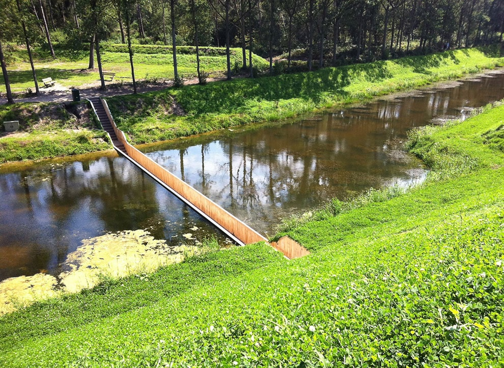 Архитекторы спроектировали мост таким образом, что издалека он невидим, так как практически целиком погружен в воду. Пешеходный настил находится гораздо ниже уровня воды, а при приближении проступает как узкий разрыв в воде.