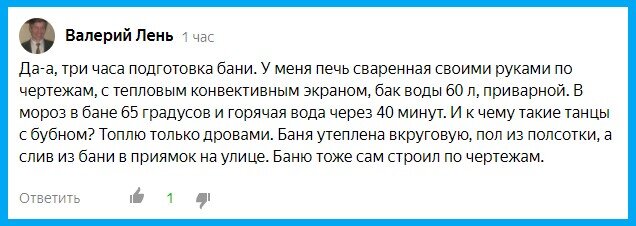 "Да-а, три часа подготовка бани. У меня печь сваренная своими руками по чертежам, с тепловым конвективным экраном, бак воды 60 л, приварной. В мороз в бане 65 градусов и горячая вода через 40 минут. И к чему такие танцы с бубном? Топлю только дровами. Баня утеплена вкруговую, пол из полсотки, а слив из бани в приямок на улице. Баню тоже сам строил по чертежам."