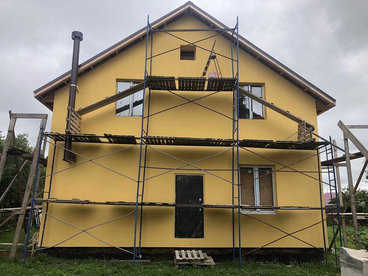 В комплектацию полный теплый контур входят окна Rehau Blitz, двери металлические с терморазрывом. Внешняя отделка – штукатурка с покраской, цвет "лимонный", фактура - короед. Внутренняя отделка не предусмотрена, это дело наживное, главное, что этажи уже связаны монолитной чистовой лестницей.