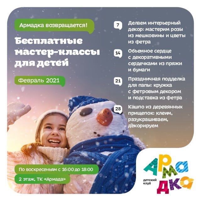 Расписание БЕСПЛАТНЫХ мастер-классов детского клуба "Армадка" в феврале
