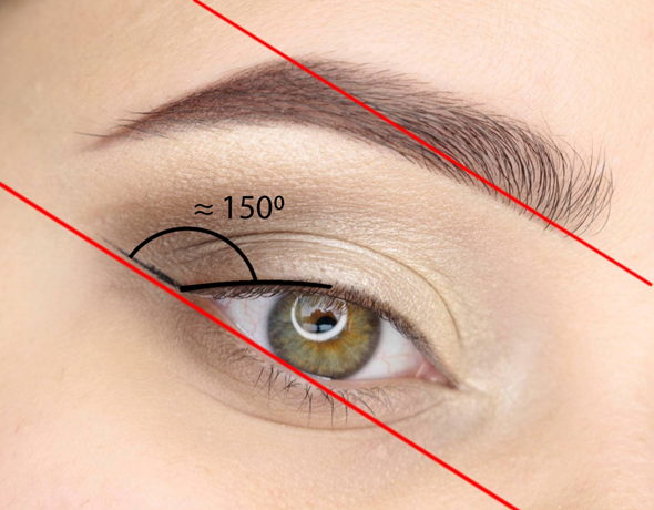 Думаю бежать за транспортиром не стоит, но для некоторых такое объяснение оказывается довольно понятным. Еще одним ориентиром, который пожалуй будет проще для большинства, станет бровь. Точнее линия которую нужно мысленно провести от нижней точки начала брови к её наивысшей точке, направляющая должна быть примерно параллельно ей. Думаю фото всё объясняет намного яснее)