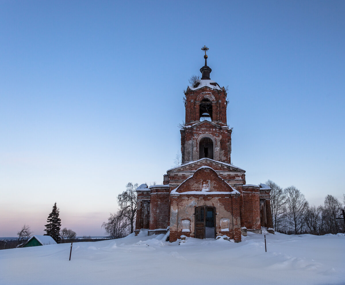 По дороге в Калязин мы заехали в село Будимирово посмотреть церковь Благовещения, построенную в 1827 году. Очень красивый и необычный храм с запоминающейся ротондой сейчас в плачевном состоянии – верхний ярус, купол и перекрытие не дожили до наших дней.