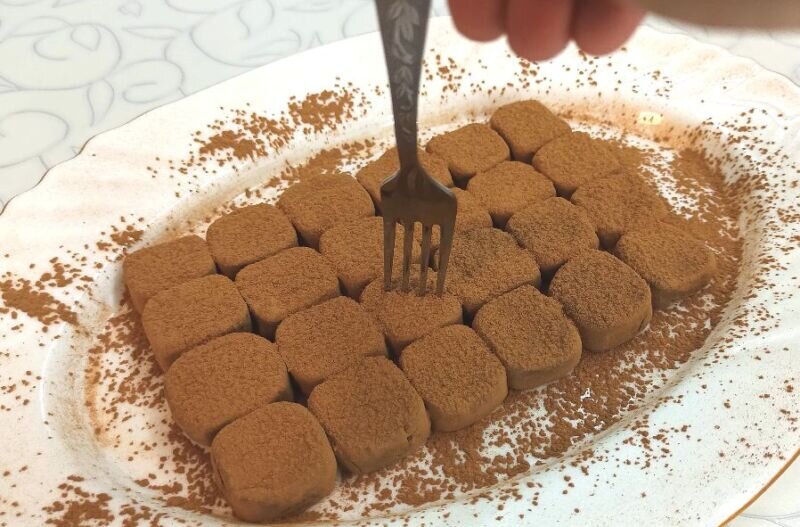 6.В принципе, можно уже пробовать, что получилось. Или можете руками слепить из квадратиков конфеты другой формы. Я просто немного округлила углы. Можно скатать шарики. После лепки снова присыпьте тонким слоем какао, чтобы скрыть следы пальцев и выровнять слой.