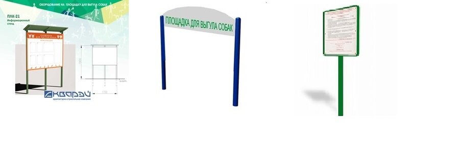 1. Информационный стенд, табличка «ПЛОЩАДКА ДЛЯ ВЫГУЛА И ДРЕССИРОВКИ СОБАК», информационная табличка с правилами выгула собак и справилами дрессировки собак.