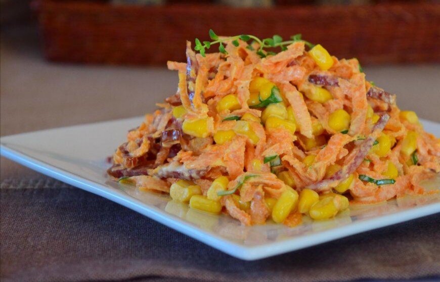 Выкладываем в миску горошек, кукурузу и все остальные подготовленные ингредиенты. Заправляем майонезом и все хорошо перемешиваем.