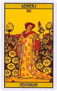 Полное описание колоды на сайте: Аркан украшает красивая женщина в дорогих одеждах. Пентакли образуют сад вокруг нее. Дивный волшебный сад с ручными птицами и плодоносными растениями. Она одна гуляет по нему, наслаждаясь жизнью. Девятка Пентаклей сильно созвучна с Девяткой Кубков. В ней другой пафос но та же суть. На Девятке Кубков герой достиг внутренней гармонии, благодати и наслаждался ей. Он ставил своей целью обрести умиротворение и счастье. Герой Пентаклей шел другим путем. Он очень хотел произвести что-то ощутимое и совершенное, прекрасное. На Восьмерке он преуспел в этом. И сейчас он имеет полное право насладиться сам своими результатами. Когда мы созидаем что-то внешнее, мы тем самым увеличиваем и свой капитал. Тот, кто производит что-то ценное, через это всегда богатеет. И не важно, делал человек на Восьмерке что-то на продажу, или же для себя, он изменил свой мир. Он стал богаче на то, что произвел. Сейчас он осознал это и искренне радуется. Он потребляет результаты своего