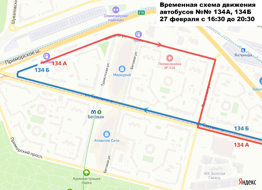 27 февраля в дневное и вечернее время будут изменены маршруты автобусов №№ 14, 134А, 134Б из-за временного перекрытия движения по Рюхиной улице и Яхтенной улице.