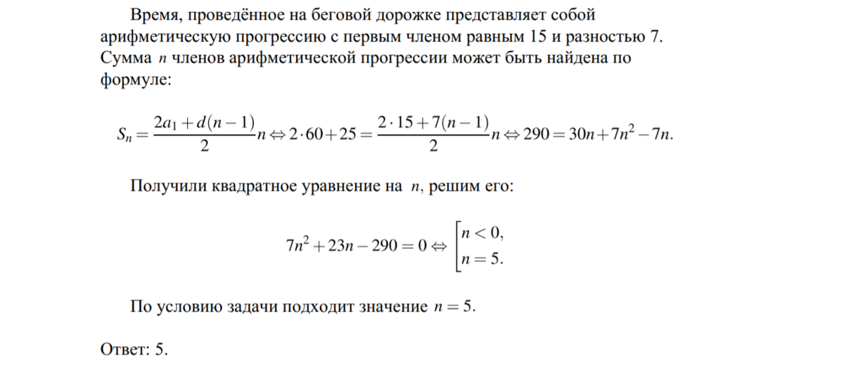 Тренер посоветовал Андрею в первый день занятий провести на беговой дорожке 15 минут, а на каждом следующем занятии увеличивать время, проведённое на беговой дорожке, на 7 минут. За сколько занятий Андрей проведёт на беговой дорожке в общей сложности 2 часа 25 минут, если будет следовать советам тренера?