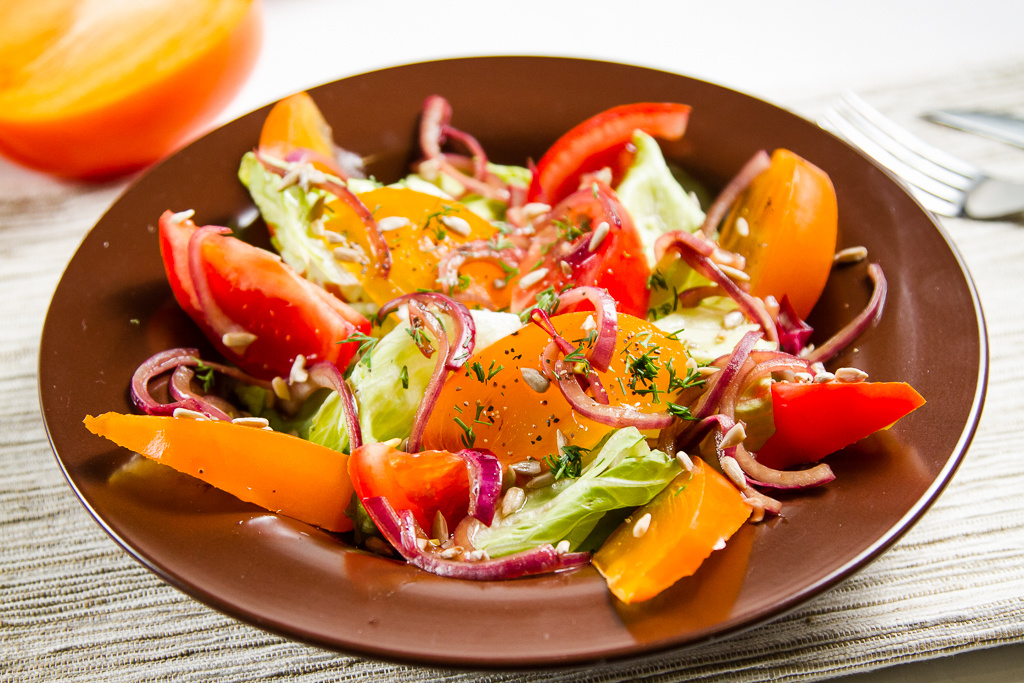 Овощи и фрукты красного и оранжевого цветов стимулируют обменные процессы, улучшают кровообращение, помогают бороться с апатией. Поэтому салат с солнечной хурмой и красными помидорами повысит жизненный тонус и работоспособность.