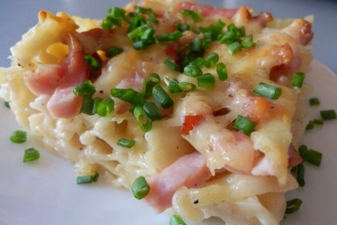 ШАГ 1 Подготовить высокую форму, смазать ее маслом, уложить на дно макароны, на них – нарезанный карбонад (колбасу или ветчину), по вкусу добавить специи, поперчить. Молоко подсолить, добавить воды (можно и без нее), но пропорцию жидкость-макароны необходимо выдержать, залить в форму.