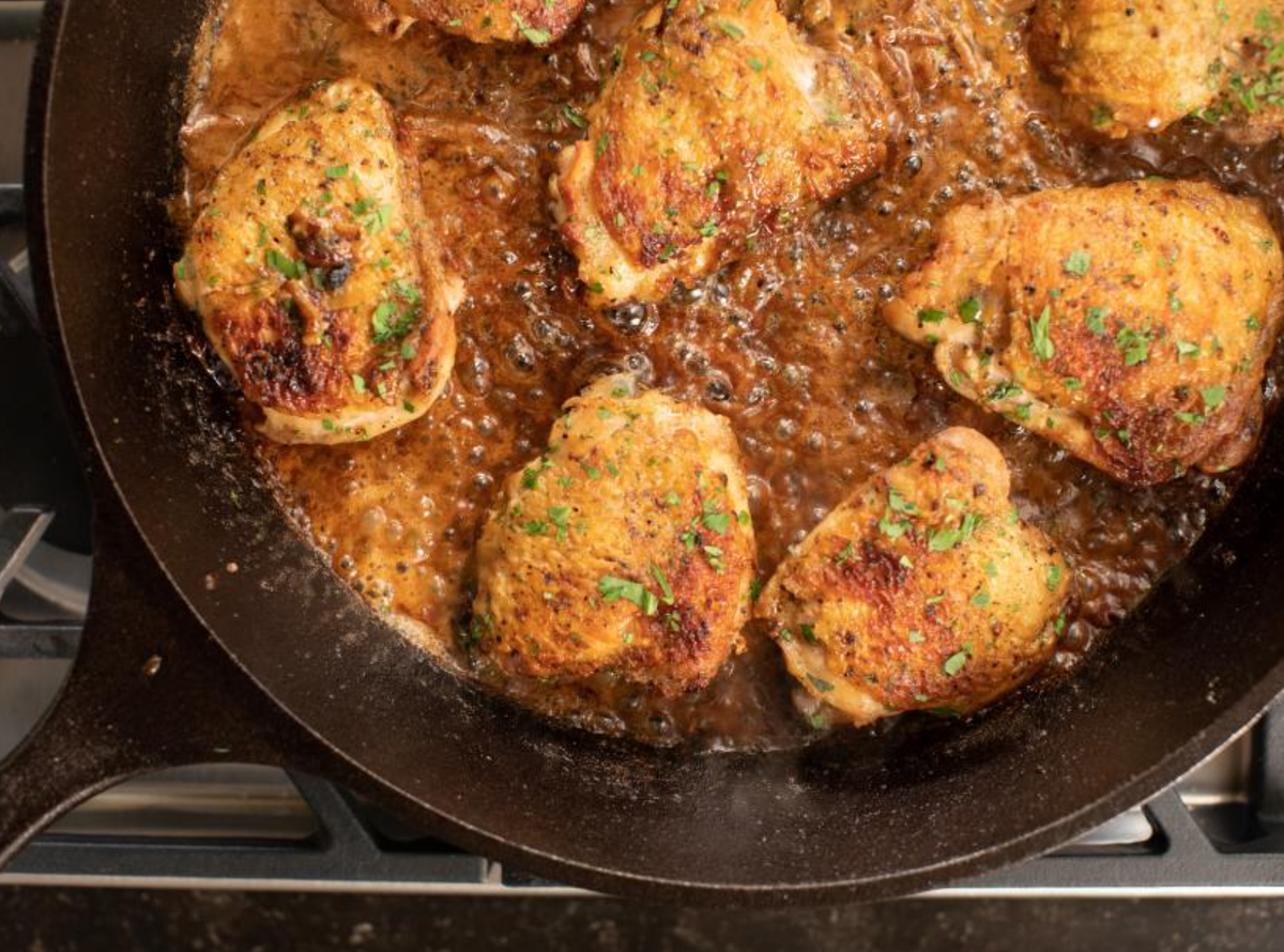 - Варить на среднем огне 15 минут без движения, пока кожица не станет золотисто-коричневой. (Если кожа становится слишком темной, уменьшите огонь.) Переверните кусочки курицы щипцами, добавьте лук в сковороду, в том числе под курицу, и готовьте на среднем огне в течение 15 минут, периодически помешивая лук, пока бедра готовятся, а лук подрумянивается.