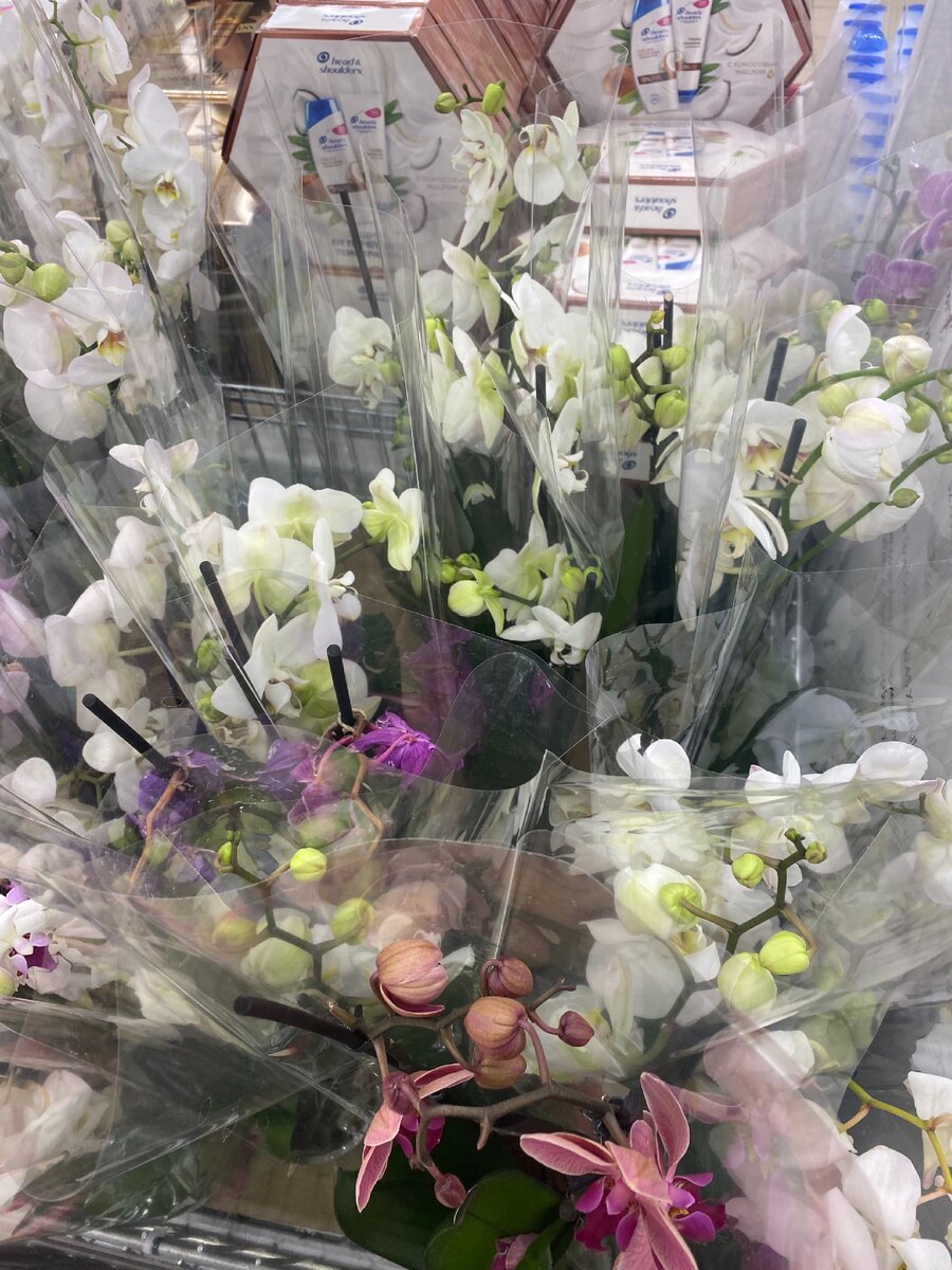 Цветы в горшке будут радовать женщину несколько лет, в то время как букет завянет через несколько дней. Фаленопсис в горшке из 2-ух веточек. Высота 55 сантиметров, диаметр 12 см.