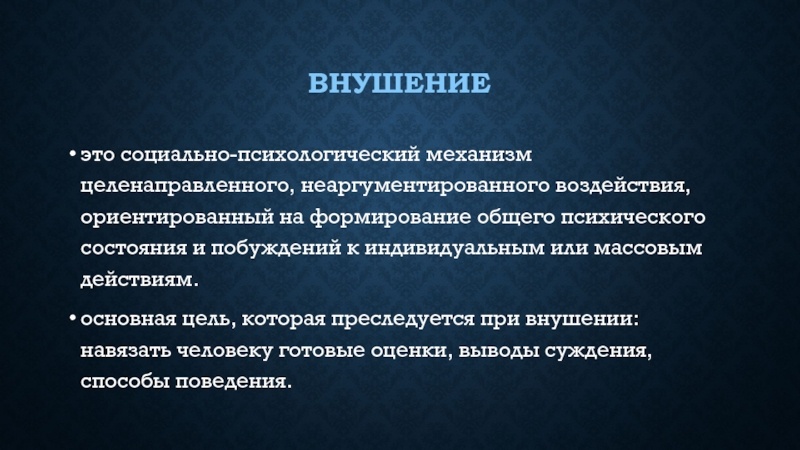 Кроме того, существует такое понятие, как внутригрупповая внушаемость. Практика показывает, что в коллективе люди гораздо проще поддаются внушению, без сопротивления принимая правила группы. Так выражается наша подсознательная установка не выделяться из коллектива, чтобы не быть отвергнутым.