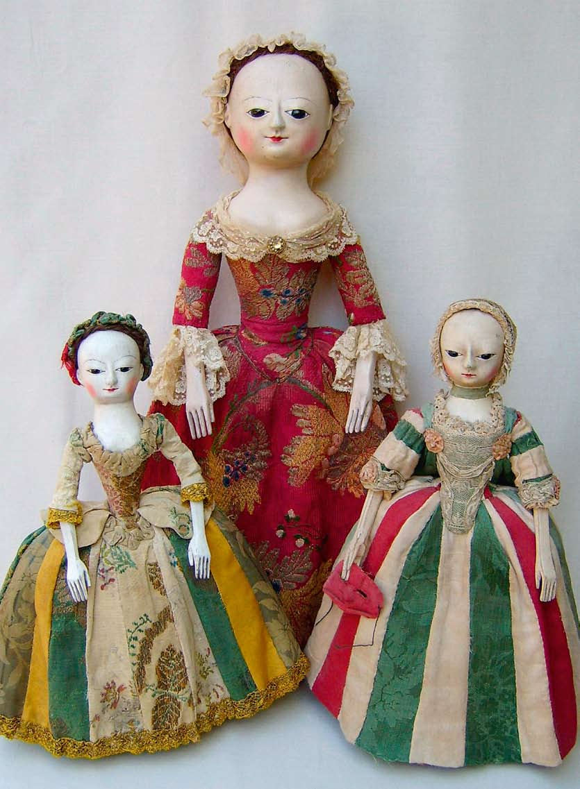 Пол: Чтобы восстановить образ куклы и ощущение от нее — точно такое же, как было три-четыре столетия назад, для платьев мы всегда стараемся использовать исключительно антикварный текстиль и отделочные материалы, большая часть которых была произведена еще в XVIII веке. Обычно это бывает не так сложно, ведь мы увлеченно коллекционируем антикварные ткани, поэтому, приступая к очередному наряду, бывает достаточно просто выбрать из нашей коллекции наиболее подходящий для конкретного случая лоскут. Мы чувствуем, что использование таких тканей придает каждой нашей работе неповторимый флер аутентичности. В большинстве случаев кукольной одеждой занимается Дэвид, но иногда, когда требуется более сложный покрой, эскиз отрисовываю я. Здесь необходимо отметить, что, несмотря на то что платья для кукол создавалась по образцу нарядов модных дам того времени, шились они не по тем же правилам. Кукольные облачения были тщательно продуманы, очень часто моделью для куклы выступала дочка или жена мастера. Все это необходимо помнить. Когда платье завершено, мы фиксируем его на теле куклы: во-первых, чтобы идеально сидело, во-вторых, чтобы нежная антикварная ткань не пришла в негодность, если кому-то вдруг придет в голову начать раздевать и переодевать куклу. Раздетые куклы мы никогда не продаем, даже если просят. Так как мы очень скрупулезно подходим к выпуску каждой нашей работы из мастерской, очень часто бывает так, что готовая кукла отсаживается на полку, где ей нагишом приходится дожидаться, пока нам не подвернется «правильная» антикварная ткань и мы сможем одеть нашу леди именно в то, что ей положено по статусу.
