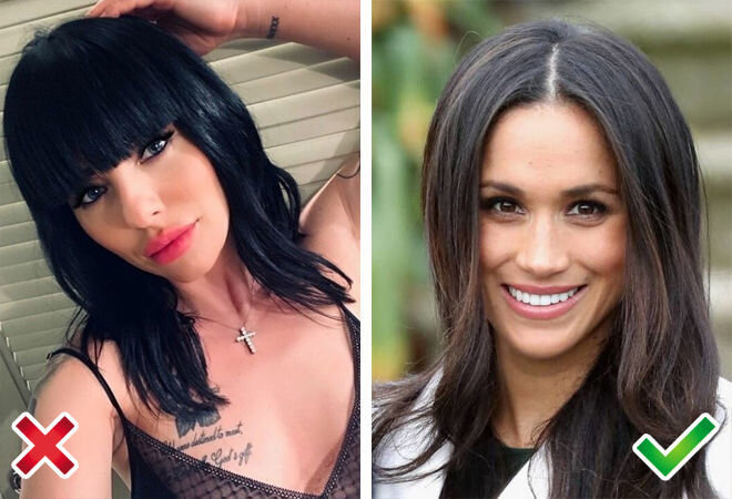 Слишком прямые, разглаженные волосы подчеркнут любые недостатки лица и прибавят возраста. Стрижки с геометрическим пробором смотрятся очень эффектно, но обычно только на журнальных фото. Если хотите выглядеть молодо, свежо и естественно, следует избегать причесо с прямым пробором.