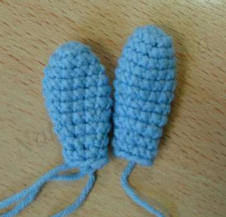 Через оставшееся отверстие набиваем тело и ножку. Присоединяем нить для другой ноги, чтобы сначала вязать по полотну, а воздушные петли провязать последними. Начальный конец оставляем не очень короткий и снаружи, им потом зашьем дырочки между ногами.