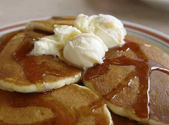 5. Сложите блины стопочкой и подавайте, положив сверху кусочки сливочного масла, шарики ванильного мороженого и щедро полив кленовым сиропом.