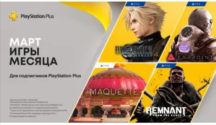 Прогноз Инсайдеров всё-таки подтвердился. Он говорит, что сотрудники Европейской компании PlayStation всё-таки трутся на всех этих информационных ресурсах. Как видите, слух от инсайдера все-таки подтвердился, что говорит о том, что сотрудники компании Sony выпустят remake Final Fantasy 7, который в принципе, сам по себе неплох. Я до этого говорил, что игрушка неплохая, и я бы рубанулся в нее, но на инглише, конечно же, я этого делать не буду. Также в марте выйдет, если не ошибаюсь, апдейт этого ремейк до PlayStation 5, который будет не бесплатный, но собственно ту же самую игру, если захочу в нее рубануться, то я ещё должен заплатить повторно за версию PlayStation 5, но это в общем принципе классика компании Sony, которая тулит обновлённой версией игр на свою следующую платформу. Народ, в целом, конечно же, нельзя сказать, что раздача, вы знаете, полный шлак. Вот как по подборки игр, игры на самом деле все средничковые, и от себя могу сказать, что мне интересен был весь Final Fantasy, но опять-таки на русском языке. Остальное, вот Remnant farpoint и эта головоломка Maquette, для PlayStation 5, реально пройдут мимо меня в марте месяца, поскольку я не буду тратить своё время на эти игры, мне вот именно завались, Я думаю как и вам владельцам PlayStation 4 и PlayStation 5 есть во что поиграть. Так что возможно, моё мнение будет немного субъективным, но это чистая лопата, такая знаете, вот со средней руки, с коленки вот именно раздали. Нам вот насыпали туда какого-то такого среднего, вот именно каких-то средних игр. Да вы можете говорить о том, что игры имеют довольно неплохие оценки на metacritic. Но опять-таки, что такое metacritic? Я лично прекрасно знаю и понимаю: metacritic - это не авторитет, который говорит, что игра прям "вау!". Ну что там оценки, как искусственно повышаются, так и искусственно занижают. Единственным плюсом в этой раздаче, и вообще от компании Sony, я лично увидел одно - это вот эта головоломка Maquette, которая как только сразу выйдет 2 марта, если не ошибаюсь, и сразу попадет под раздачу в PlayStation 5, то - есть эта такая щедрость от компании Sony: вот игра только вышла, и мы вам ее даем, но опять-таки, это только для владельцев PlayStation 5. А остальные большинство владельцев PlayStation 4? Вот я, Не будучи владельцем PlayStation 5, вообще бы наверное Бомбил и горел бы от такой раздачи, в принципе, что я и делаю сейчас, поскольку играть мне не во что. Я реально разочарован раздачей от кампании Sony в марте, поскольку как я уже сказал, что она проходит мимо меня. Возможно, эти игры найдут по - любому свою аудиторию, но моё мнение в данном месяце и в данном выпуске немного будет субъективным. Так что вывод: мартовская раздача игр PlayStation Plus 2021 года от компании Sony - чисто лопата. Да конечно, если сравнивать с играми, которые раздают Xbox Live Gold,то это лопата с блинами но с икрой мы не будем сравнивать так как это разные платформы.